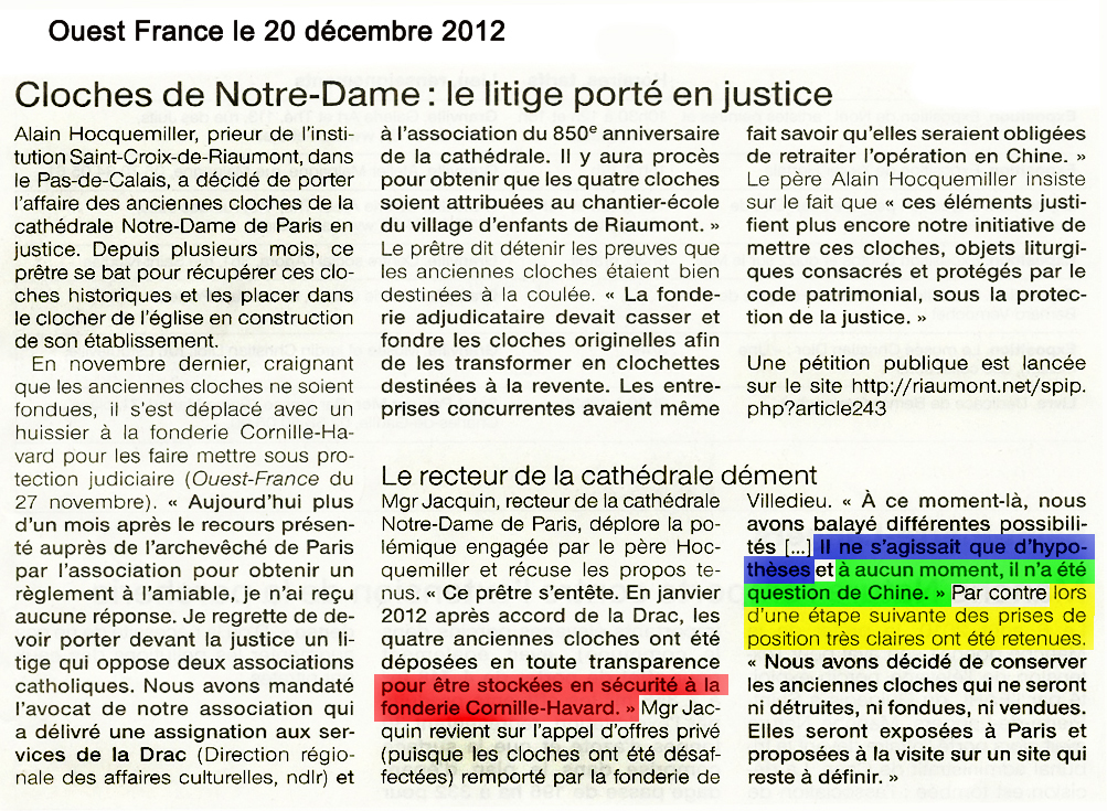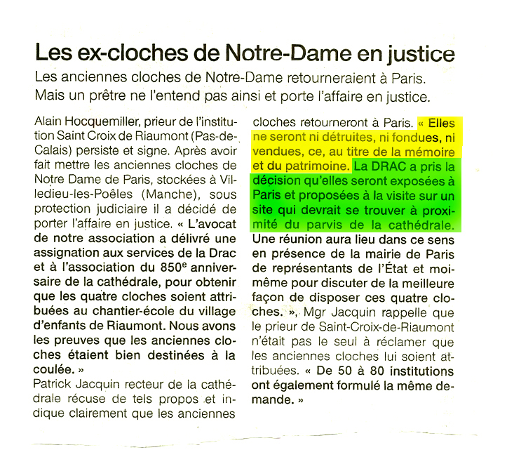 - Que les quatre cloches ont été proposées à Riaumont en date du 09 juillet par la DRAC, seule instance décisionnaire en la matière, dans une réunion en ses locaux, devant témoins [1]voir le rapport de l’Observatoire du Patrimoine Religieux sur http://www.patrimoine-religieux.fr/rubriques/gauche/adherez/paris-cloches-de-notre-dame-cr-rdv-cerclet.doc ou … Continue reading