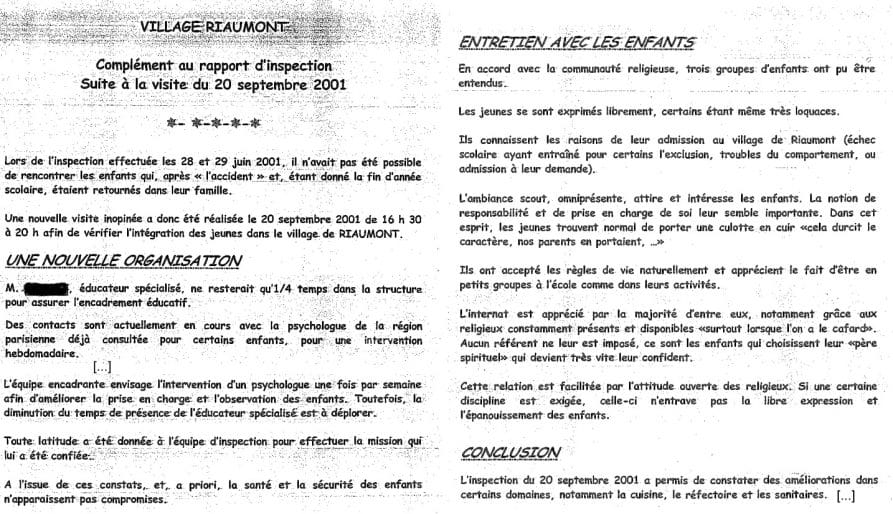 Lors de l’inspection effectuée les 28 et 26 juin 2001 [lendemain du suicide de Romain] Il n’avait pas été possible de rencontrer les enfants qui après l'”accident” étaient retournés dans leur famille. Une nouvelle visite inopinée a donc été réalisée le 20 septembre 2001 de 16h30 à 20h00 afin de vérifier l’intégration des jeunes dans le Village de Riaumont. […]