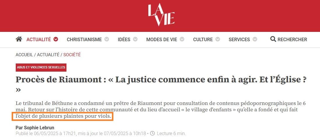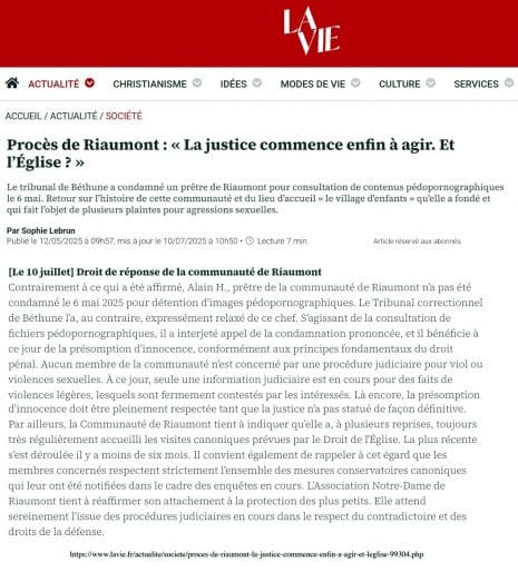 L’article de La Vie, dans sa version initiale publiée le 6 mai 2025, comportait plusieurs inexactitudes graves : mauvaise qualification pénale de la première condamnation du père Alain H., et évocation infondée de procédures pour viols visant la communauté de Riaumont. Ces éléments furent alors modifiés silencieusement dans la version datée du 12 mai 2025, sans qu’à aucun moment l’article ne signale clairement au lecteur les erreurs initiales ni les raisons des modifications des premières versions électroniques de son article en ligne. Graves diffamations déjà diffusées aussi publiquement hélas dans la version papier de ce journal !